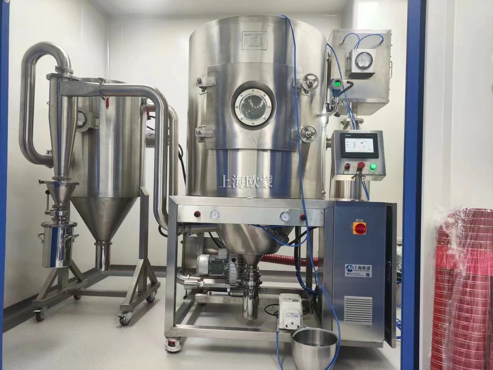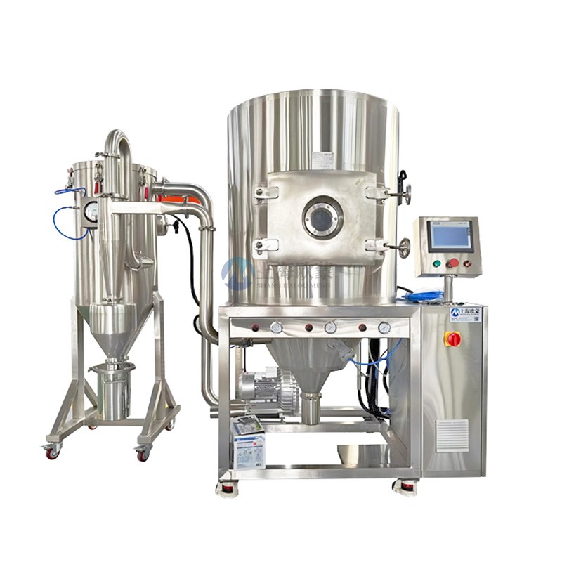 噴霧干燥機(jī)為開式循環(huán),并流式,離心式霧化。干燥介質(zhì)空氣經(jīng)過初、中效空氣過濾器過濾后根據(jù)操作指令由鼓風(fēng)機(jī)吸取再經(jīng)加熱器加熱通過高效過濾器的熱風(fēng)分配器進(jìn)入噴霧干燥主塔。液體物料根據(jù)操作指令經(jīng)過蠕動(dòng)泵,進(jìn)入高速旋轉(zhuǎn)的離心噴頭,在離心力作用下被分散成小霧滴。在噴霧干燥主塔內(nèi),小霧滴與熱風(fēng)在充分接觸,沿其特定路徑進(jìn)行熱交換后被干燥成為產(chǎn)品,然后通過旋風(fēng)分離器實(shí)現(xiàn)分離,固體物料被收集,氣體介質(zhì)再經(jīng)過過濾后被排出。整套噴霧系統(tǒng)易清潔、無死角,符合GMP要求。